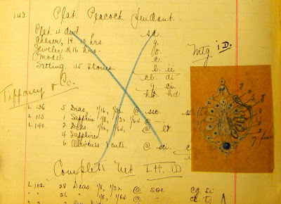 Above: Manz sketch for a ring with cabochon sapphire, sold to Moore & Mason, 1925; below, Manz sales record for a panther and snake ring purchased by Tiffany & Co in 1913; bottom, drawing of a panther stickpin set with a cabochon gem from Manz's design scrapbook