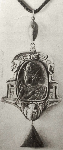 - "The rings in the collection were immense and the settings of gems in etruscan gold, as well as the large brooches of lapis lazuli, Cyprian glass sphynx (sic) head, in the styles of over 2,000 years ago, made a decidedly beautiful and instructive collection..." (1)